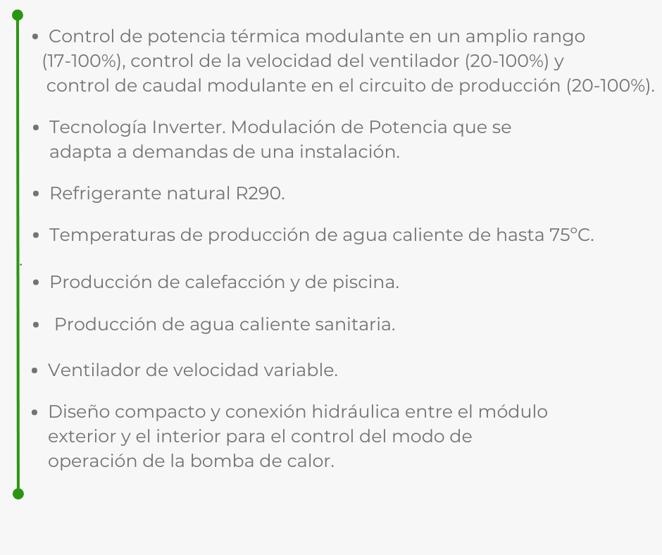 El control de velocidad del compresor optimiza la entrega energética al evitar ciclos de arranque-parada, garantizando un funcionamiento más estable, eficiente y silencioso. Esta gestión inteligente de la demanda térmica contribuye a la racionalización del diseño hidráulico, al disminuir la necesidad de elementos de acumulación o sistemas de respaldo sobredimensionados.